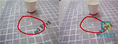 防水性點評:如圖所示,把水倒在光潔的磚表面上,8分鐘后一顆大水珠團仍然靜止在那里,并沒有擴散開來;瓷磚背面上的水流開了一點地方之后就停在那里了,8分鐘后水依舊原樣不動。正反磚面的防水測試說明這款磚的密度大,吸水率很低,品質絕對放心。
