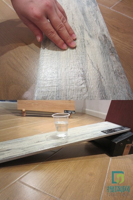 用手觸摸,木紋磚上有明顯的凹凸感,比平整的磚面形成的摩擦大,因此防滑性也更好。把木紋磚呈傾斜角度放置一杯水,也相當(dāng)平穩(wěn)的放置。在安全角度考慮,防滑性好的木紋磚適合作為地板鋪設(shè)在家裝中。