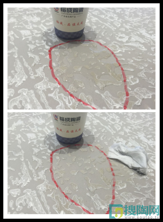我們在瓷磚的背面倒上一些水,靜候一段時間,發現水沒有擴散吸收的跡象,證明瓷磚的吸水性弱,適合長時間使用。