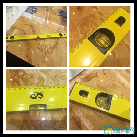 美家網測評員用水平尺測量瓷磚的平整度,水平精度氣泡在內測中央,證明瓷磚的平整度在標準范圍內。