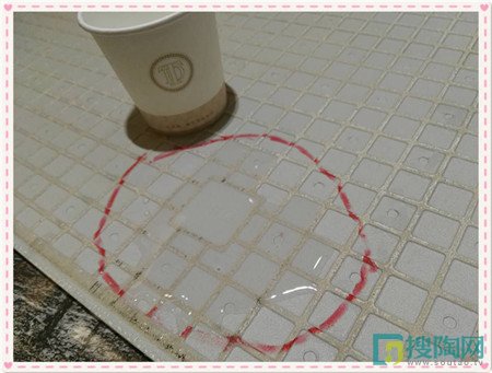 測試瓷磚的防滑性,小編將瓷磚傾斜放置后,往瓷磚表面灑上水,然后將裝有水的杯子放到瓷磚上面觀察,大家也許覺得如此透亮晶瑩的瓷磚一定很滑吧?實驗證明并非如此,觀察幾分鐘放置傾斜瓷帶有水珠的磚上水杯并沒有滑落的現象,這說明了這款瓷磚的防滑性很好哦!