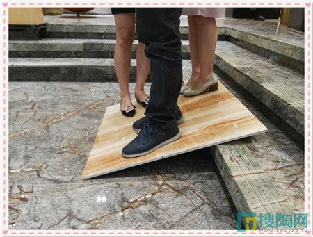 最后,我們不可忽略了這重要的一步,就是測試瓷磚的抗壓性。小編邀請現場的三位特地陶瓷工作人員站上傾斜放置的瓷磚上,三位工作人員都很爽快答應,顯然對這款瓷磚的抗壓性信心滿滿的。接著三位特地瓷陶瓷的工作人員用行動來站上傾斜的瓷磚上面,結果證明了這款特地瑞士紅玉金剛玉石瓷磚的抗壓性非常的好!