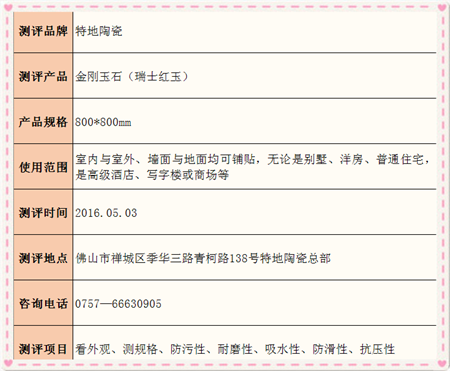 【測評總結】:經過以上小編親自對特地瑞士紅玉金剛玉石瓷磚的一系列的測試之后,發現此款瓷磚在每一個項目測試中都表現得相當不錯,加上通透的外觀,可謂是經得起考驗,上得了大雅之堂,特地瓷陶瓷的確做到了由內而外的完美升級!