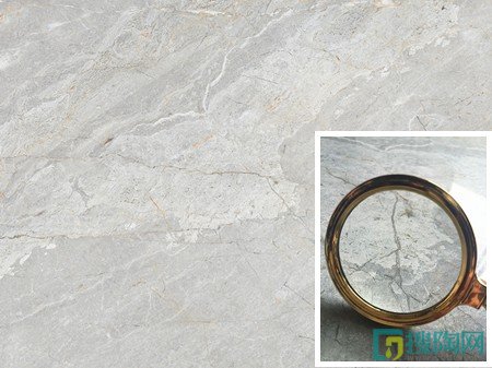 透過放大鏡我們可以看到其紋理細(xì)膩流暢,紋理清晰可見。畫面富有石材的天然質(zhì)感,整體紋路以不規(guī)則的紋理走向描繪石材的視覺效果,并結(jié)合柔和的金色線條紋理,灰、白、金三色交織重現(xiàn)天然石材的自然裂紋效果。在古樸柔和之上,展現(xiàn)歷史與現(xiàn)代交替的時尚之美。