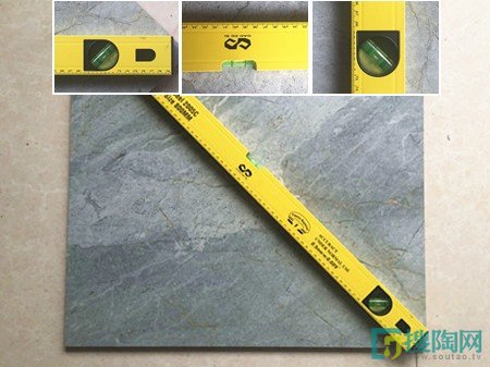 小編用水平尺分別放在瓷磚表面不同位置進(jìn)行檢測,經(jīng)過檢測得出結(jié)果是水平尺上的三點(diǎn)平衡水珠都分別位于中間,沒有超出平衡范圍,說明這款瓷磚的平整性夠好。平整性好能讓瓷磚鋪貼不易出現(xiàn)起翹現(xiàn)象。