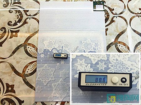 在測驗中小編把光澤儀放在瓷磚表面,發現這款雅系列瓷磚光澤度在88度左右。細看雅系列瓷片,質感晶瑩通透。磚面顏色純正,在燈光下散發出隱隱的光澤。