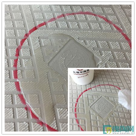 瓷磚的吸水性是至關重要的,鋪在地上吸水性太強會造成液體滲透,把水泥中的水吸進瓷磚,從而產生印跡。美家測評員在瓷磚的反面用紅色油性筆畫了個圈然后倒入水,靜置幾分鐘,發現水并沒有出現擴散或滲透的跡象,片刻后,測評員把紙巾放入,水很快就被紙巾吸收了,證明這款瓷磚不易吸水。