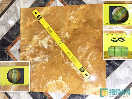 優越的產品必須經得起各種考驗,良好的平整性就是消費者們選購條件之一,平整性代表著使用久了能減少空鼓,或者出現不夠貼合地面等等的狀況。小編使用專業測量的水平尺測量這款黃鉆玉石瓷磚,測試評分為三個標尺的氣泡均在中間最為標準,而黃鉆玉石的平整度也是相當的不錯,氣泡均在黑線范圍內,符合測試標準。