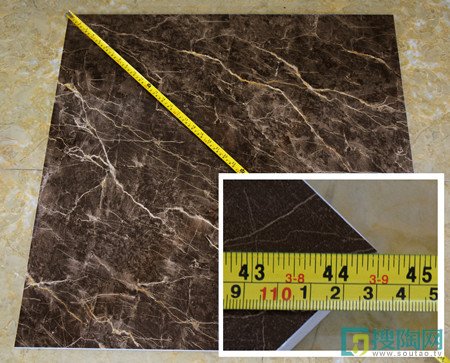 小編拿來卷尺測量了這款荷蘭金啡大理石瓷磚的規格,測量結果:邊長800mm,對角線長1131mm,與商家給出的尺寸相符。按照800mm*800mm的正方形計算,對角線應該是1131.3708mm。尺寸數據與實際測量數據準確無誤,是一款規格正式的好產品。