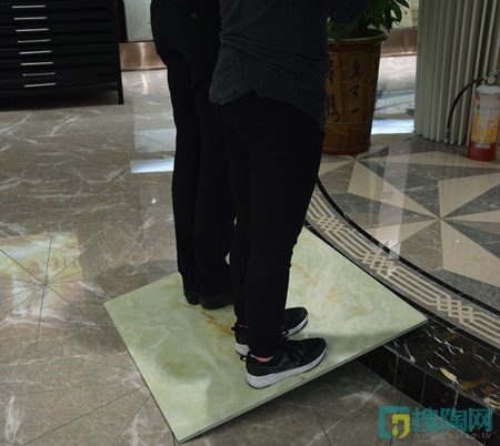 測(cè)評(píng)員把瓷磚成斜面放好,與地面行成三角形,在瓷磚上面站上2位成年人,瓷磚沒(méi)有出現(xiàn)任何裂痕,可見千克拉玉石的抗壓性能十分不錯(cuò)。