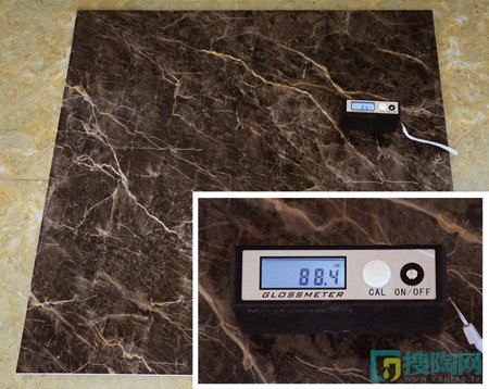別看這款荷蘭金啡大理石雖然是以啡色為磚面,但是它在燈光下看起來不但有強烈視覺沖擊,還泛著隱隱的光澤,測試員使用專業的光澤度儀,在瓷磚表面移動不同的位置測試,最后結果為多個位置光澤度的平均值。測試結果為88.4度,光澤度在同款大理石中是非常不錯。