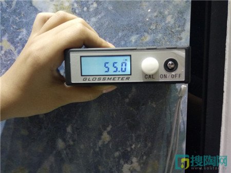 測評人員把測試光澤度的專業儀器放在瓷磚表面,經過測試,這款柔光磚的光澤度為55°。是非常標準的一個度數,在還原天然石材亮度的同時也不會造成光污染,值得推薦哦。