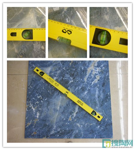 美家測試員用平度尺放在瓷磚表面,測試評分為三個標尺的氣泡均在中間最為標準,通過上圖可以看到,水晶藍柔光瓷磚的平整度是相當的不錯,氣泡均在黑線范圍內,符合測試標準。