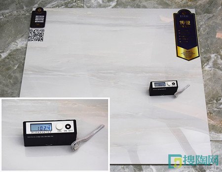 測試員使用專業(yè)的光澤度儀,在瓷磚表面移動不同的位置測試,最后結(jié)果為多個(gè)位置光澤度的平均值。測試結(jié)果為102.4度,光澤度可以說是讓人意想不到的好。
