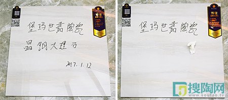 質(zhì)量過關(guān)的瓷磚,易清潔并且抗污性很高。美家網(wǎng)評測人員用水性筆在瓷磚表面寫上幾個(gè)字后靜置幾分鐘,然后用紙巾拭擦瓷磚上面的污跡,結(jié)果污跡很輕松就被擦干凈,而瓷磚還是依然光潔如新,無需任何洗滌劑!