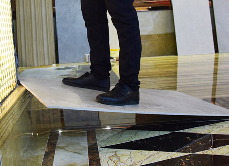 瓷磚良好的抗壓性,能防止出現(xiàn)裂痕和容易受到較重的物品擊碎。為此小編這次采用了比較特殊的方式來測試,測評員把瓷磚以單角獨撐的方式放置于高20cm,同時讓工作人員站在瓷磚上面,瓷磚沒有出現(xiàn)開裂的現(xiàn)象。經(jīng)測試證明這款瓷磚抗壓性非常好,即便獨角支撐也能通過考驗。