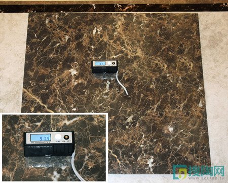 測試員使用專業(yè)的光澤度儀,在瓷磚表面移動不同的位置測試,最后結(jié)果為多個(gè)位置光澤度的平均值。測試結(jié)果為97.4度,光澤度在同款大理石中是相當(dāng)不錯(cuò)。