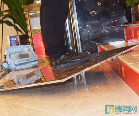 良好的抗壓性,能防止出現(xiàn)裂痕和容易受到較重的物品擊碎。對于選購家居使用的瓷磚也是非常重要的考慮因素之一。為此小編這次采用了比較特殊的方式來測試,測評員把瓷磚以單角獨(dú)撐的方式放置,并請現(xiàn)場的一位稍健碩的工作人員站上去,瓷磚沒有出現(xiàn)開裂的現(xiàn)象。說明這款瓷磚抗壓性還是經(jīng)受得起考驗(yàn)的。