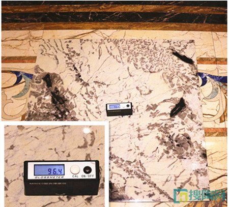 測評瓷磚必不可少的一項環節就是光澤度的測試,小編使用專業的光澤度儀,在瓷磚表面移動不同的位置測試,最后結果為多個位置光澤度的平均值。測試結果為96.4度,光澤度可以說是讓人意想不到的好。