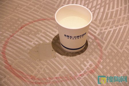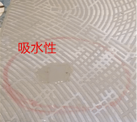 為了檢測瓷磚的吸水性能,將瓷磚翻過來,往背面倒上一些清水。如果清水滲的越慢,說明瓷磚的質地細密,品質高。相反則品質低。經過了幾分鐘的時間,瓷磚上的水幾乎沒有被吸收,說明這瓷磚的密度高,品質高,不易吸水。