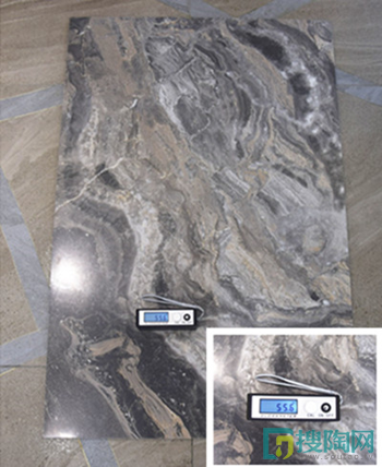 別看該款威尼斯雖然是以棕色為磚面,但是它在燈光下看起來不但有強(qiáng)烈視覺沖擊,還泛著隱隱的光澤,測試員使用專業(yè)的光澤度儀,在瓷磚表面移動不同的位置測試,最后結(jié)果為多個位置光澤度的平均值。測試結(jié)果平均值為55度,光澤度在同款瓷磚中是非常不錯。