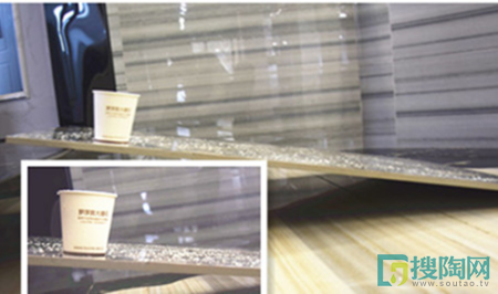 地磚的防滑性對于家居安全是很重要的,所以在購買瓷磚的時候一定要注意選購防滑性能高的。測評員把瓷磚傾斜擺放,然后在瓷磚表面灑滿水,把裝有水的杯子放在瓷磚上,觀察幾分鐘,可以看到即使在滿是水珠的磚面,也沒有發(fā)現(xiàn)水杯在瓷磚上滑行,也證明了該款瓷磚的防滑性極好。