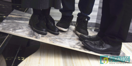 瓷磚的硬度是衡量一塊瓷磚質(zhì)量好壞的重要指標(biāo),對于選購家居使用的瓷磚也是非常重要的考慮因素之一。在傾斜的磚面上站了三個成年人,瓷磚并無出現(xiàn)變形、裂紋、破碎現(xiàn)象,說明該款瓷磚抗壓性還是經(jīng)受得起考驗(yàn)的。