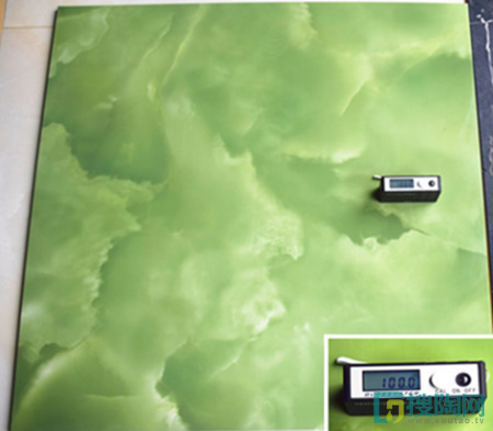 使用專業的光澤度儀,在瓷磚表面移動不同的位置測試,最后結果為多個位置光澤度的平均值。測試結果為100度,光澤度可以說是讓人意想不到的好。