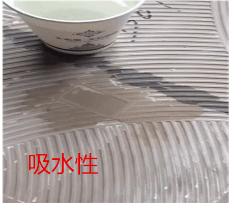 為了檢測瓷磚的吸水性能,將瓷磚翻過來,往背面倒上一些清水。如果清水滲的越慢,說明瓷磚的質地細密,品質高。相反則品質低。經過了幾分鐘的時間,瓷磚上的水幾乎沒有被吸收。實驗證明該產品具有致密度高、吸水率低的性能優勢,生產制作質量極佳。