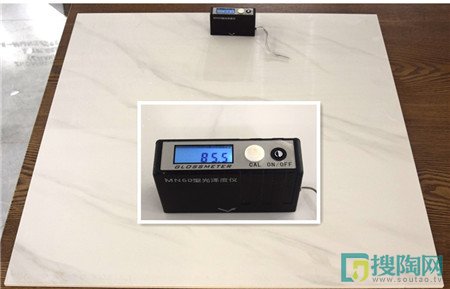 接下來,美家網測評小組對這款瓷磚的光澤度進行了測試。測評人員將光澤測試儀置于瓷磚表面,在瓷磚表面移動不同的位置測試,最后選取多個位置光澤度的平均值。測試的結果為85.5度,與中盛陶瓷給出的數值范圍一致。