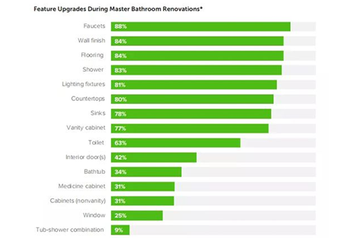 ■節水龍頭、大尺寸花灑、智能馬桶、定制浴室柜等:根據調查報告,在過去一年翻新了衛生間的美國業主中,最多人更換了水龍頭,占受訪人數的88%。排除非衛浴產品,排在其后的依次是花灑(83%)、面盆(78%)、浴室柜(77%)、馬桶(63%)、浴缸(34%)等。