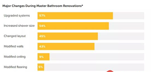 ■花灑:在更換了花灑的業主中,有57%和54%的人更換了淋浴系統和更大的花灑,45%的人更改了淋浴布局,43%的人更換了淋浴區的墻面。