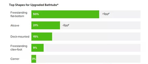 在獨立式浴缸中,平底浴缸選用率大幅領先于貓腳浴缸