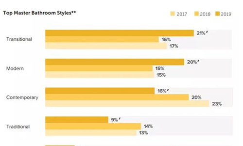 衛生間風格方面,最受寵的是過渡風格(Transitional),選擇這種風格的人從2018年的16%增至2019年的21%?,F代風格(Modern)也備受歡迎,選用率達20%,較去年提高5個百分點。相反,當代風格(Contemporary)和傳統風格(Traditional)持續失寵,選用率為16%和9%,較去年下滑4點和5點。最后,田園風格(Farmhouse)在美國的受歡迎程度依然偏低。