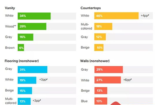 3、美國人新購入的浴室柜、臺面采用最多的顏色是白色,而地板、墻面采用最多的顏色是灰色。