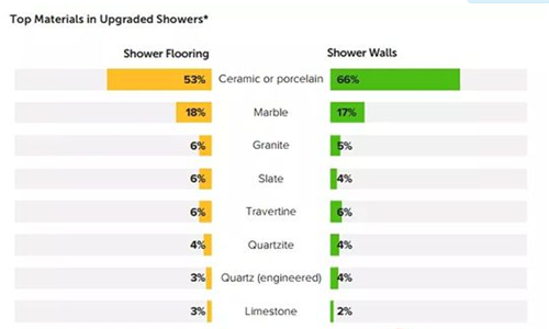 在淋浴區的墻面和地板,超過一半受訪者選用了瓷磚,選用率大幅領先于大理石、花崗巖、石板、石灰華等。