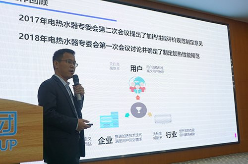 隨后,海爾電熱水器超前研發總監趙小勇就“儲水式電熱水器加熱性能測試規范工作”進行了介紹。他指出,隨著消費者對品質生活的向往,電熱水器加熱速度、倍速增容等內容得到廣泛關注,這就促發行業必須建立行之有效的測試方法。2017年,相關方提出議題;2018年成立工作組,并開啟了加熱性能評價規范的制定。截至目前,工作組成員形成了較為一致的共性意見,尤其就加熱速度試驗方法和增容倍數試驗方法形成了規范文本,此次繼續征求大家意見,如大家對此版規范內容無異議,下一步則將著手規范的落地和實施。