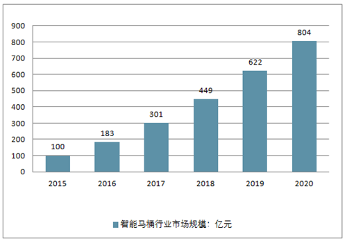 2015年,中國智能馬桶行業(yè)市場規(guī)模破百億,2018年達(dá)到449億元,2019年預(yù)計達(dá)到622億元,到2020年有望突破804億元,智能馬桶正以每年超25%的速度迅速增加。