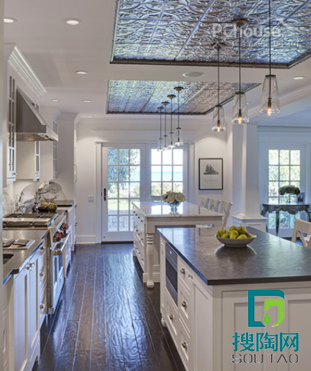 這樣的方法你是否想到?大部分的家庭廚房天花都是保持單調(diào)的純白,但是如果把瓷磚鑲嵌在天花板上,利用瓷磚打造廚房的吊頂,或者拼砌特殊的圖案,都可以讓你的廚房更加別致和個(gè)性。