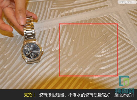 看瓷磚吸水率。一般來說,瓷磚的吸水率低,代表瓷磚的內在穩定性越高,也就越適合濕氣或水分含量較高的空間,如衛生間、廚房等,且不會產生黑斑等問題。檢驗瓷磚吸水率的常用方法是將瓷磚的背面倒水,滲透緩慢甚至不滲水的瓷磚質量較好,反之則為不好。