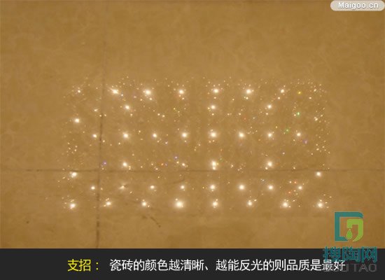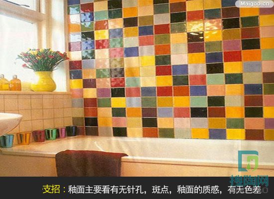 觀察瓷磚的表面的顏色和平整度。一般來說,瓷磚的顏色越清晰、越能反光的最好。另外看一下有沒有針孔,針孔容易堆積贓物。也可以從痕跡看品質,檢查瓷磚的表面質量,可以用硬物刮一下瓷磚釉面從而判斷瓷磚的表面。