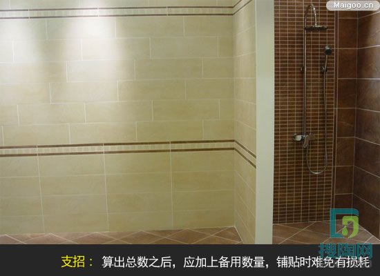 瓷磚可以論塊出售,或者按平方米出售,在購買瓷磚前應計算要鋪貼的面積。有的圖表只要知道貼瓷磚墻面的高度和寬度,即可查出瓷磚用量。有的瓷磚包裝箱上也會列明一箱瓷磚可鋪貼多大面積。粗略計算起來,80平方米的面積可按640塊約14厘米見方的瓷磚或320塊20厘米見方的瓷磚計算。算出總數之后,應加上一定的備用數量,因為鋪貼時難免有損耗。也可以利用這個公式大致算出所需要的瓷磚量:(裝飾面積÷每塊瓷磚面積)×(1+3%),就是施工時所需瓷磚塊數,其中3%是施工損耗量。