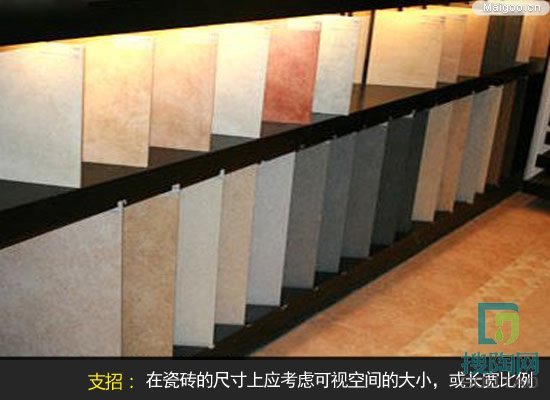 在瓷磚的尺寸上應考慮可視空間的大小,如果客廳被家具遮擋的地方多,也就是地面使用時,人的實際可視的大小,如果可視面積小的話,也應考慮用小一點規格的。又或者考慮客廳的長寬比例及大小,就效果而言,以瓷磚能全部整片鋪貼為好,就是指到邊盡量不裁磚或少裁磚,盡量的減少浪費,一般而言,瓷磚規格越大,浪費也越大。